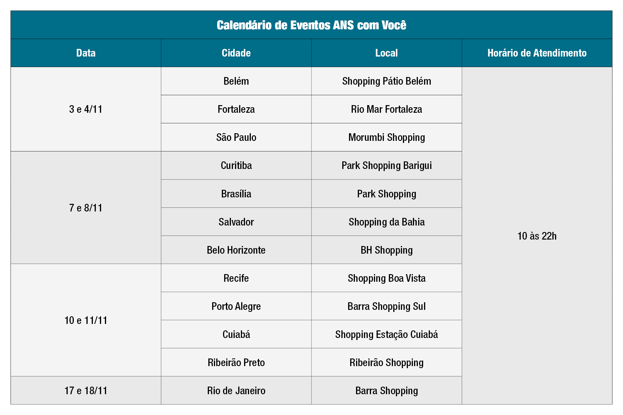 A Agência Nacional de Saúde Suplementar (ANS) vai realizar uma série de eventos nas cinco regiões do Brasil para aproximar a reguladora dos consumidores. No período de 3 a 18 de novembro, técnicos da Agência participarão da ação “ANS com Você”, esclarecendo dúvidas sobre temas relacionados ao setor de planos de saúde em estandes montados em shopping centers nas 12 cidades onde há núcleos de atendimento presencial.