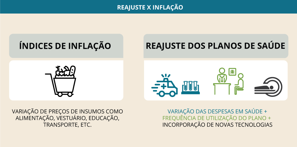 Os índices de inflação medem a variação de preços de produtos e serviços. Já os índices de reajuste de planos de saúde são “índices de custos”, pois medem a variação combinada não somente de preços, mas também de quantidades consumidas. Dessa forma, o percentual calculado pela ANS considera aspectos como as mudanças nos preços dos produtos e serviços em saúde, bem como as mudanças na frequência de utilização dos serviços de saúde.