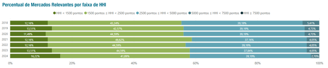 O gráfico abaixo apresenta o percentual de mercados relevantes em cinco diferentes faixas de concentração: as faixas à esquerda representam mercados menos concentrados, ao passo que as faixas à direita representam mercados mais concentrados. Enquanto o percentual de mercados menos concentrados (verde escuro) cresceu para 16,22%, o de mercados excessivamente concentrados (azul escuro) caiu para 2,7%.