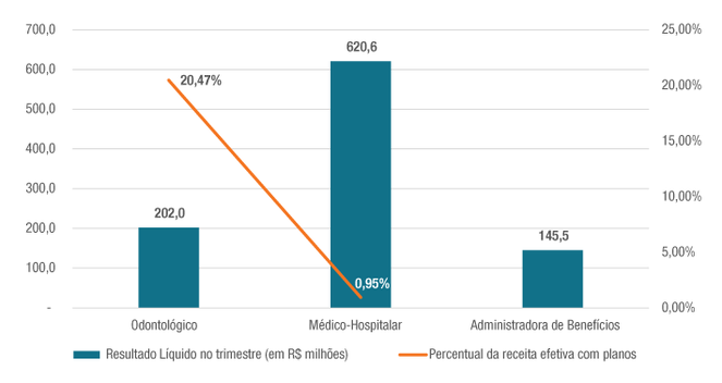 Nos números agregados por segmentos regulados pela ANS, o resultado líquido do setor foi positivo para todos os segmentos: as administradoras de benefícios registraram superávit trimestral de R$ 145,5 milhões; as operadoras exclusivamente odontológicas (OPS OD) R$ 202 milhões (cerca de 20,5% da sua receita efetiva planos odontológicos); e as médico-hospitalares (OPS MH) R$ 620,6 milhões (0,95% da receita efetiva de seus planos).