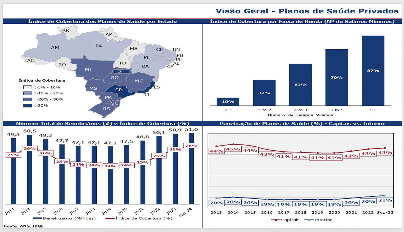 A análise por faixa de renda revela que 87% das pessoas que recebem cinco salários mínimos ou mais possuem cobertura de planos de saúde, um índice que demonstra a concentração desse benefício em camadas de maior poder aquisitivo. “Embora a cobertura seja alta entre os mais favorecidos economicamente, precisamos refletir sobre o acesso à saúde nas faixas de renda mais baixas, onde a necessidade de suporte é igualmente crítica”, comenta Pedroni.