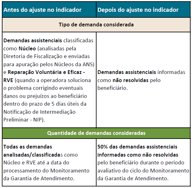 Com o ajuste no indicador aprovado na 608ª Reunião da Diretoria Colegiada da ANS, realizada em 1º de julho de 2024, o Monitoramento da Garantia de Atendimento passou a usar um número maior de demandas assistenciais registradas na ANS pelos consumidores. A grande diferença é que o novo indicador considera 50% do total de demandas informadas como não resolvidas pelos beneficiários no período referente a cada ciclo como base de cálculo do numerador. Diferente do indicador anterior, que se baseava em demandas assistenciais analisadas e classificadas pela Diretoria de Fiscalização. O denominador permanece usando como base a média do número de beneficiários no período.