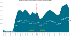 No caso do período entre abril e maio de 2020, a redução de protocolos emitidos pode ser decorrente do receio das pessoas trocarem de plano durante o período de incertezas do início da pandemia, além da dificuldade em conseguir atendimento presencial nas operadoras de destino, para efetivação da portabilidade.