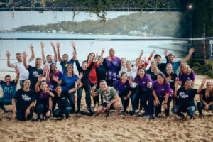Serginho do Volei, embaixador da Allcare, posa para foto com colaboradores, em São Paulo