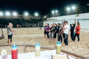 Serginho do Volei, embaixador da Allcare, posa para foto com colaboradores, em São Paulo