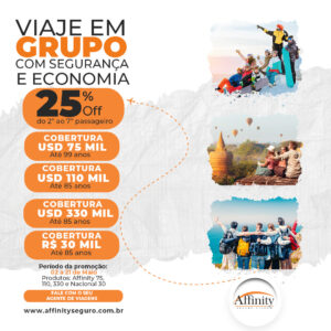 O Affinity Seguro Viagem lança hoje (02/05) uma promoção especial que promete tornar as viagens em grupo ainda mais acessíveis e seguras. Com descontos de 25% para a emissão do 2º ao 7º passageiro, trata-se de uma oportunidade única para quem planeja uma aventura em família ou com amigos.