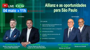 O Clube dos Corretores de Seguros de São Paulo (CCS-SP) realizará live no dia 4 de maio, às 11h, com a participação de executivos da Allianz Seguros. Na ocasião, Eduardo Dal Ri, diretor executivo Comercial e Flavio Rewa, diretor Comercial Regional São Paulo Capital, abordarão o tema “Allianz e as oportunidades para São Paulo”.