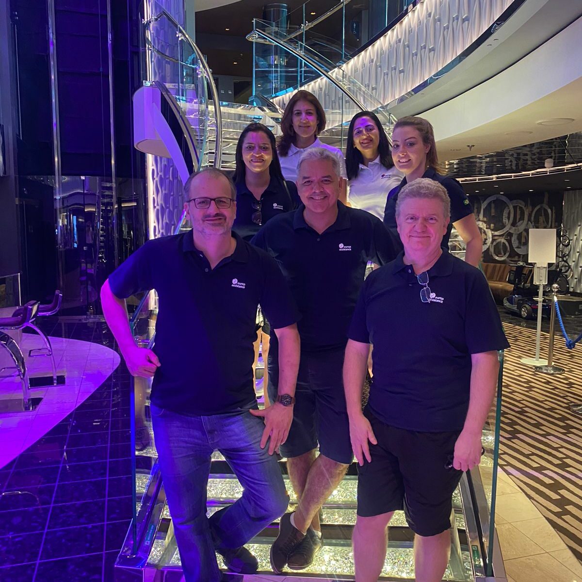 O executivo (no centro da imagem) esteve com a equipe da Europ Assistance Brasil a bordo do MSC Seashore, que fez sua estreia em águas brasieliras e é o maior navio desta temporada.