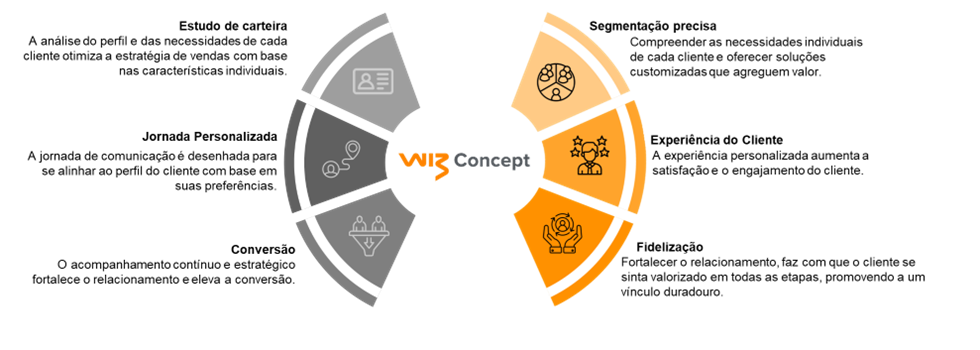 “A nossa atuação é segmentada por três momentos. O primeiro é o estudo detalhado da carteira, que permite otimizar a estratégia de vendas baseado no perfil do cliente. Em seguida, a partir desse resultado, é desenhada uma jornada específica, que leva em conta as preferências, comportamento de compra, estilo de vida, localização geográfica, faixa etária, entre outros. Por fim, visamos a fidelização, já que o cliente, ao longo de todo o ciclo, passa por interações estratégicas”, explica Raquel Oda, Diretora de Operações e Performance da Wiz Concept. “O acompanhamento contínuo não apenas fortalece o relacionamento, mas também eleva a taxa de conversão e fidelização, pois o cliente se torna familiarizado com o produto e é apoiado em cada etapa, graças ao engajamento progressivo e especializado do time da Wiz Concept”, completa a executiva.