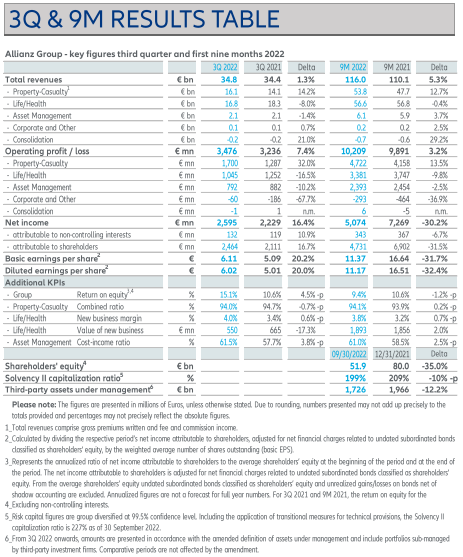 9M 2022: O PVNBP foi de 49,6 (58,9) bilhões de euros, espelhando o impacto de dois eventos – uma renegociação de contrato em grupo na Itália e um acordo único de resseguro da Allianz Reinsurance –,  ambos no ano anterior, bem como os números reduzidos em produto de prêmio único na Alemanha.