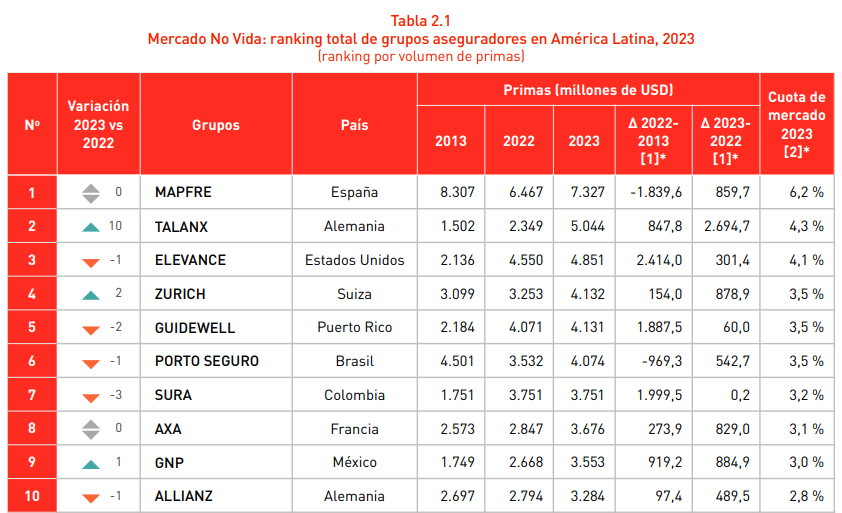 Em 2023, o ramo de Não Vida representou 57,7% dos prêmios na região, mantendo a porcentagem do ano anterior. Os mercados que apresentaram o maior crescimento foram México, com um aumento de 34,4%, Costa Rica com 24,4% e Argentina com 21,3%. Brasil, com 22,5% da participação de prêmios, México com 21,1% e Argentina com 15,9% são os mercados mais representativos neste ramo. Por grupos, a MAPFRE lidera o ranking de Não Vida com prêmios de 7.327 milhões de dólares (13,3% a mais) e uma participação de mercado de 6,2%, à frente de outros concorrentes como a alemã Talanx ou a americana Elevance.