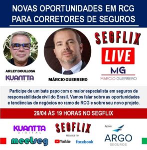 De acordo com o apresentador da transmissão e fundador do canal SEGFLIX, Arley Boullosa, é preciso diferenciar a demanda de negócios, quando falamos sobre modalidades de seguros a serem oferecidas para os segurados. “Nunca foi tão importante para os corretores de seguros diversificar e buscar outros negócios. Olhar para dentro da sua carteira e identificar oportunidades é muito importante em qualquer segmento e a carteira de RCG tem tido um crescimento forte nos últimos anos devido a sua amplitude. Márcio Guerrero é o maior especialista no assunto e os corretores que participarem do nosso bate papo terão uma aula sobre o ramo e negócios. Hoje temos seguros de Responsabilidade Civil para quase todas as profiss&ot ilde;es e atividades, então, é hora de colocarmos mais um produto na prateleira”, explicou.