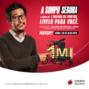 A Sompo Seguros S.A., empresa do Grupo Sompo Holdings – um dos maiores grupos seguradores do mundo, acaba de lançar a campanha A Sompo Segura e ainda dá 1 milhão de Pontos Livelo para você. Até 3 de março de 2022, os corretores de seguros têm a oportunidade de expandir a atuação nos ramos Automóvel, Empresarial, Residencial, Vida Individual e Condomínio ao mesmo tempo em que acumulam pontos que podem ser trocados por produtos e serviços como acessórios para casa, esporte e lazer, tecnologia, beleza e saúde, moda, infantil, automotivo, entre outros.