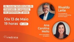 A Via Direta Corretora de Seguros realiza uma transmissão online, que acontece no dia 13 de maio, às 19 horas, com o tema “As novas tendências do mercado de seguros: Os próximos 25 anos”. O evento conta com a presença do Vice Presidente Comercial e Marketing da Porto Seguro, Rivaldo Leite e da Sócia-Fundadora da Safe2Go, Ana Carolina Mello. A live será transmitida no canal do YouTube da Via Direta. Para se inscrever, é só acessar o https://conteudo.viadiretaseguros.com.br/inscricao-webinar e efetuar a inscrição.
