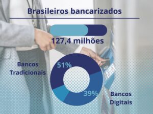 Atualmente são em torno de 127,4 milhões de brasileiros (67%) que possuem contas bancárias, 51% em grandes bancos como a Caixa Econômica Federal, o Bradesco e o Banco do Brasil. Mas 39% possuem conta em bancos digitais, o Nubank, por exemplo, aparece depois destes grandes bancos como preferência dos entrevistados.