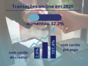 Também, durante a pandemia, houve um aumento de 32,2% no comércio on-line, onde o uso do cartão permitiu a movimentação de R$ 2 trilhões no ano passado, 8,2% a mais do que no ano anterior. O uso do cartão de crédito teve uma alta de transações de 2,6% e o cartão pré-pago de 107,4%.
