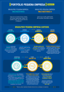 Além disso, a Brasilprev também passa a disponibilizar os fundos espelho para o segmento, estratégias em parceria com gestoras independentes. O produto Brasilprev Pequena Empresa Multigestores conta com os fundos AZ Quest, Claritas, JGP, Canvas Capital, Adam Capital, Vinci Equilíbrio, Leblon, BTG Pactual Discovery e Multigestor I, este administrado pela Brasilprev. Já o Brasilprev Pequena Empresa Multigestores II, conta com os fundos espelho Verde AM Long Bias, Kinea Sigma e Occam.