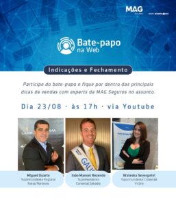 A MAG Seguros, companhia de 186 anos especializada em seguro de vida e previdência, em sua missão apoiar os corretores em seus negócios, irá realizar um bate-papo com especialistas da companhia para falar sobre Indicações e Fechamento e como esses dois processos podem ajudar os profissionais a realizarem mais vendas. O 10º episódio do Bate Papo na Web será transmitido no canal do Youtube da seguradora, na próxima segunda-feira (23), às 17 horas.