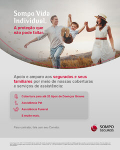 O Sompo Vida Individual é um seguro voltado a indenizar o segurado ou seus beneficiários a fim de garantir proteção financeira e contribuir com o bem-estar e qualidade de vida das pessoas. Vale destacar que o produto inclui coberturas que garantem indenização ao segurado em vida. Entre as principais coberturas do produto estão, Morte (do segurado, cônjuge ou filhos); indenização adicional por Morte Acidental; Invalidez permanente total ou parcial por acidente; Despesas médicas, hospitalares e odontológicas (DMHO); entre outras. O produto traz a opção de contratação de quatro opções de plano para a cobertura de até 20 doenças graves. Essa cobertura garante indenização ao próprio segurado, caso seja diagnosticada uma doença grave predefinida de acordo com o plano contratado. Entre os serviços de Assistência 24 Horas que podem ser contratados estão Assistência Funeral, Assistência Cesta Básica, Assistência a Vítima de Crime, Segunda Opinião Médica, Assistência Residencial, entre outros.