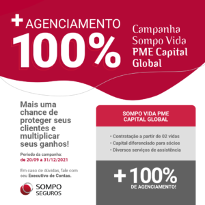 Sompo Seguros S.A., empresa do Grupo Sompo Holdings – um dos maiores grupos seguradores do mundo, acaba de lançar a campanha Agenciamento +100% para o produto Sompo Vida PME Capital Global, que visa contribuir com a geração de novos negócios e ampliar a receita dos parceiros corretores de seguros que atuam no ramo de Seguro de Vida. Por meio da iniciativa, para a cada proposta do produto Sompo Vida PME Capital Global transmitida até 31 de dezembro de 2021, o corretor recebe 100% a mais de agenciamento na primeira parcela, além da comissão.