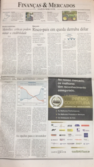 2005 – Anúncio do Prêmio Cobertura no extinto jornal Gazeta Mercantil, um dos principais jornais de economia do Brasil.