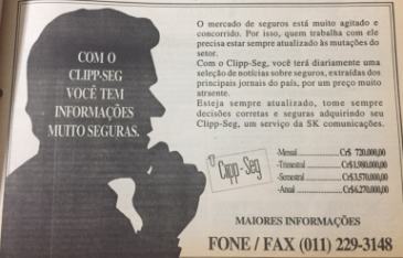 1993 – O Clipp-Seg começa a ser uma fonte de informações para os profissionais do mercado. Antes do advento da internet, as compilações das notícias do mercado de seguros são feitas dos principais jornais e revistas do Brasil, reunidas e enviadas via motoboy ou fax para os executivos do mercado de todo o Brasil.
