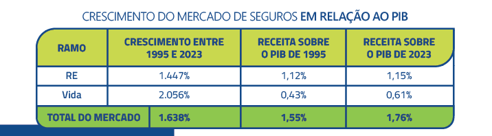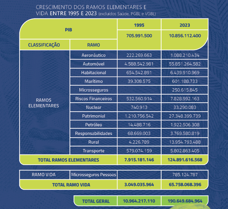 “Retirei do demonstrativo de receitas Saúde, VGBL e PGBL, pois em 1995 PGBL e Saúde eram iniciantes e com número inexpressivos e o VGBL ainda não havia sido lançado. Além disso, excluí esses ramos de 2023 para evitar poluir os resultados além disso poder analisar o crescimento real dos ramos clássicos de seguro, praticados à época, quais sejam ramos elementares e vida”, explica.